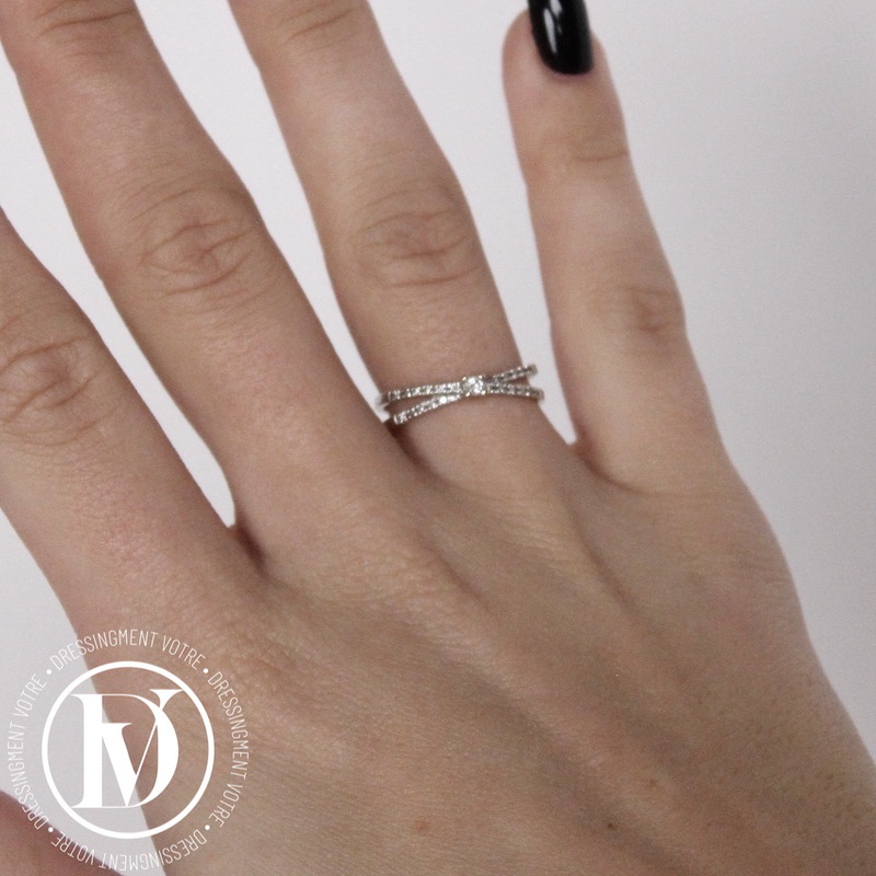 Composée de 2 anneaux entrelacés en or blanc sertis de diamants taille brillant